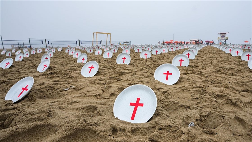 Plajdaki boş tabaklar, Birleşmiş Milletler verilerine göre dünyada açlık çeken 733 milyon insanı temsil ediyor.