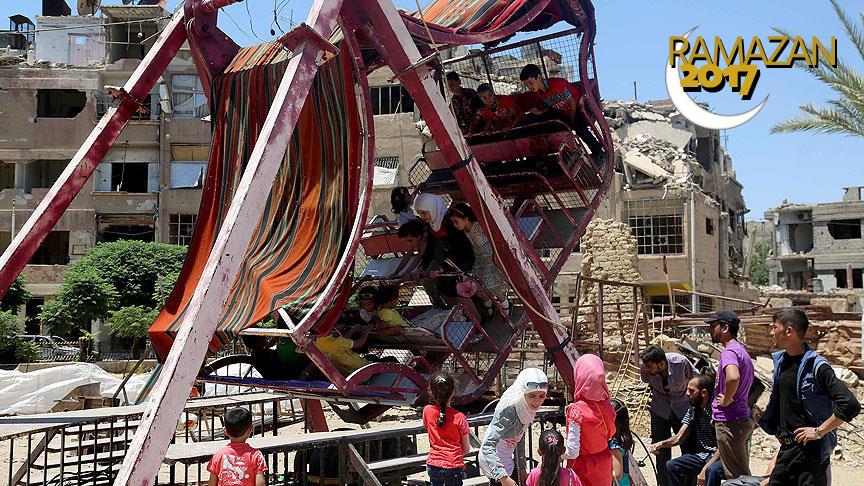 Suriye'nin başkenti Şam'da rejimin kuşatmasındaki Duma ilçesinde çocuklar, bayram sevincini hava saldırılarında yıkılan binalar arasına kurulan lunaparkta yaşamaya çalışıyor.