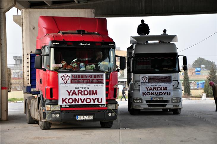 Bazı sivil toplum kuruluşlarınca oluşturulan Mardin-Suriye Yardımlaşma Platformu tarafından hayırseverlerin desteğiyle toplanan 38 ton un, 2 ton bulgur, 2 ton salça, 700 battaniye ve çeşitli giyim malzemelerinin bulunduğu 3 tır, Şanlıurfa'nın Suriye sınırındaki Akçakale ilçesine geldi. Ayni yardımlar, sınır hattında farklı araçlara yüklenerek daha önce tespit edilen bölgelere gönderilmek üzere Suriye sınırına geçti.