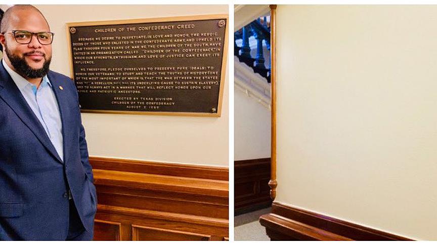 Teksas Eyaleti Temsilciler Meclisi üyesi Eric Johnson Twitter'da "Konfederasyon Çocukları" adlı kuruluş tarafından 1959'da meclis duvarına asılan levhanın kaldırıldığını duyurdu.