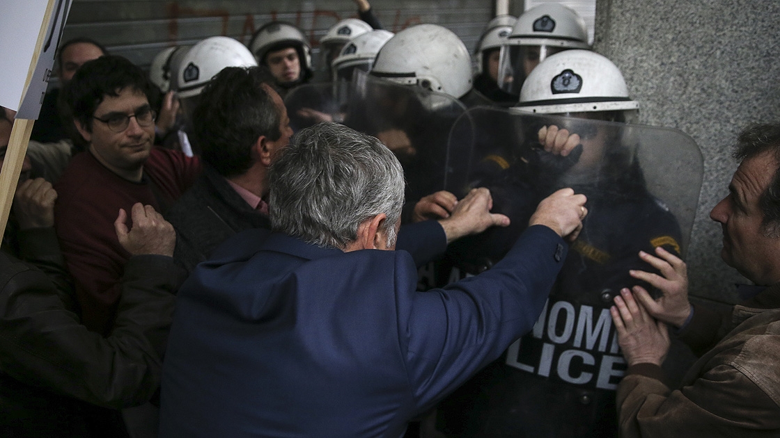Göstericilerden bir kısmı bakanlık binası önünde bulunan polis kordonunu aşarak Maliye Bakanı Efklidis Çakalotos’un makamının bulunduğu dördüncü kata çıktı. Burada, Çakalotos’un yerinde olmaması nedeniyle Maliye Bakanı Vekili Stergios Piçiorlas ile görüşen göstericiler, temizlik işçilerine yapılan ek ödemelerin kesilmemesini istedi.