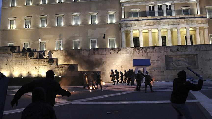 Yunanistan Kamu Çalışanları Federasyonu (ADEDY) ve İşçi Sendikaları Genel Konfederasyonunun (GSEE) çağrısıyla Sintagma Meydanı'nda gerçekleştirilen protesto eylemi sırasında yüzleri maskeli bir grup polislere molotofkokteylli saldırıda bulunarak meclise girmeye çalıştı.