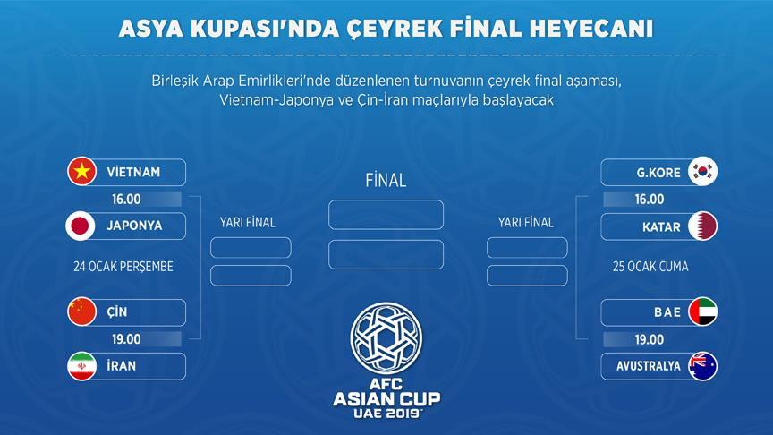 Birleşik Arap Emirlikleri'nde düzenlenen 2019 Asya Kupası'nda çeyrek final heyecanı, 24 Ocak Perşembe günü oynanacak maçlarla başlayacak.