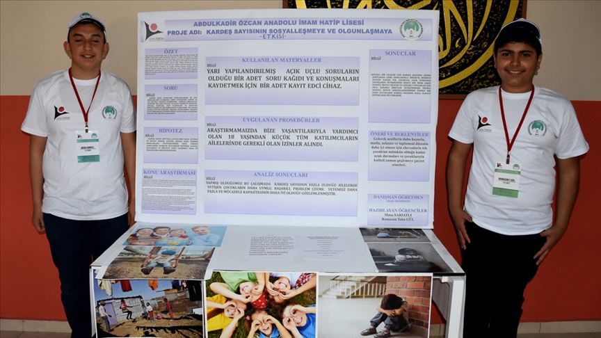 Abdulkadir Özcan Anadolu İmam Hatip Lisesi öğrencileri Musa Sarıatlı ve Ramazan Taha Gül, öğretmenlerinin de desteğiyle TÜBİTAK 4006 Bilim Fuarı kapsamında "Kardeş Sayısının Sosyalleşmeye ve Olgunlaşmaya Etkisi" konulu araştırma yaptı.