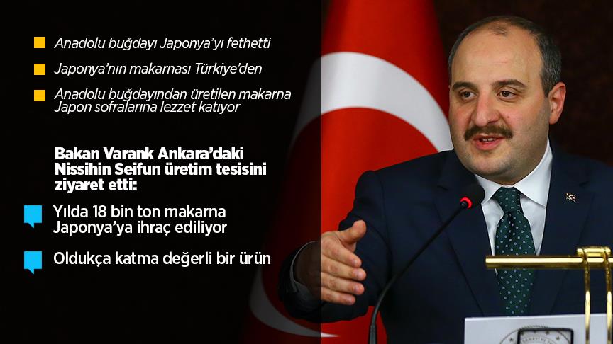 Japon makarna üreticisi Nisshin Seifun, Ankara'daki tesisinde ürettiği makarnaları, başkent Tokyo başta olmak üzere tüm Japonya'ya ihraç ediyor. Sanayi ve Teknoloji Bakanı Mustafa Varank, burada üretilen yıllık 18 bin ton makarnanın Japonya'ya ihraç edildiğini belirterek, "Normal şartlarda Türkiye'nin makarna ihracatında ton başına fiyat, 400-450 dolar civarında ama bu makarnayı 800-850 dolara ihraç ettiklerini ifade ettiler, bu açıdan da oldukça katma değerli bir ürün." dedi.