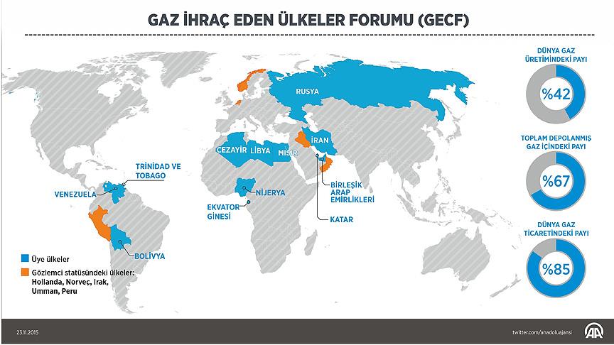 GECF üyesi ülkeler dünyadaki gazın yüzde 42'sini üretiyor. Depolanmış gazın yüzde 67'sini ve borularla taşınan gazın da yüzde 38'ini elinde bulunduran üye ülkeler, dünya gaz ticaretinin ise yüzde 85'ini gerçekleştiriyor.