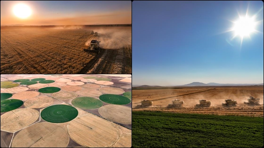 Tarlanın merkezini esas alan, yarı çap uzunluğundaki hareketli robotik sulama sistemine göre ekimin yapıldığı 492 dekarlık dairesel tarlalarda hasat, çok sayıda biçerdöverle gerçekleştirildi.