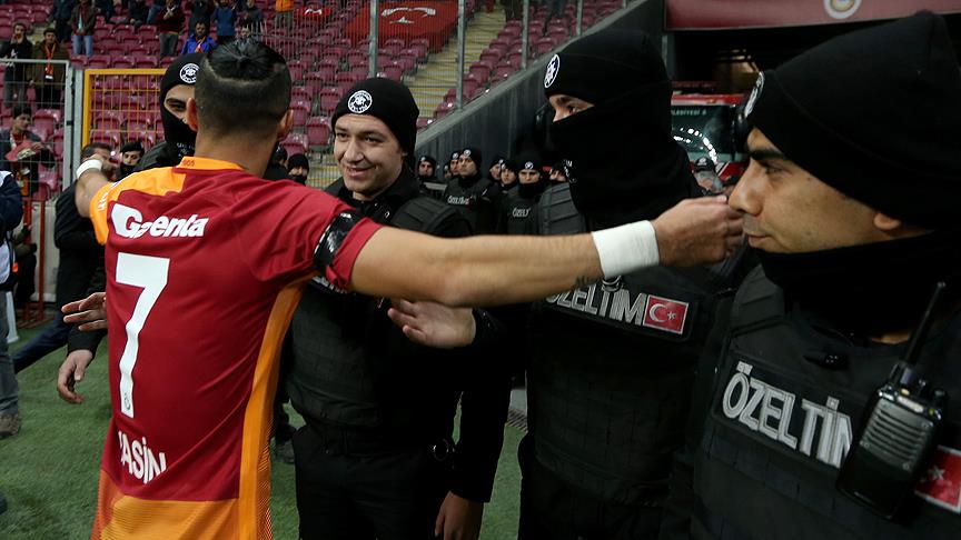 Galatasaray’ın golünü atan Yasin Öztekin, sevincini polislere sarılarak kutlarken, sarı-kırmızılı takımın kaptanı Selçuk İnan da taraftarların tezahüratı üzerine bir çevik kuvvet polisini sahanın ortasına kadar getirerek sarıldı.