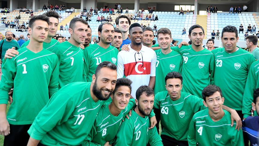Antalyaspor'un Kamerunlu yıldız futbolcusu Samuel Eto'o, "Maddeye Bağlanma Spora Bağlan" sosyal sorumluluk projesi kapsamında yapılan gösteri maçında, Türk Milli Takımı formasını giydi.