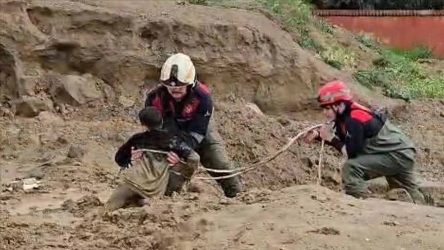 İzmir Büyükşehir Belediyesinden yapılan açıklamaya göre, Cumhuriyet Mahallesi'nde dün etkili olan yağışın ardından balçığa dönen arazide top oynayan 10 yaşındaki iki çocuk çamura saplandı.