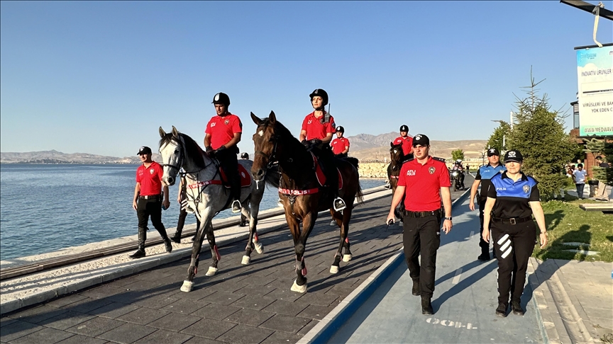 Van Gölü sahil bandı, vatandaşların yoğun bulunduğu park ve bahçeler ile toplantı, gösteri ve yürüyüşlerde görev yapacak atlı polisler, Edremit ilçesindeki sahilde ilk kez devriyeye çıktı.