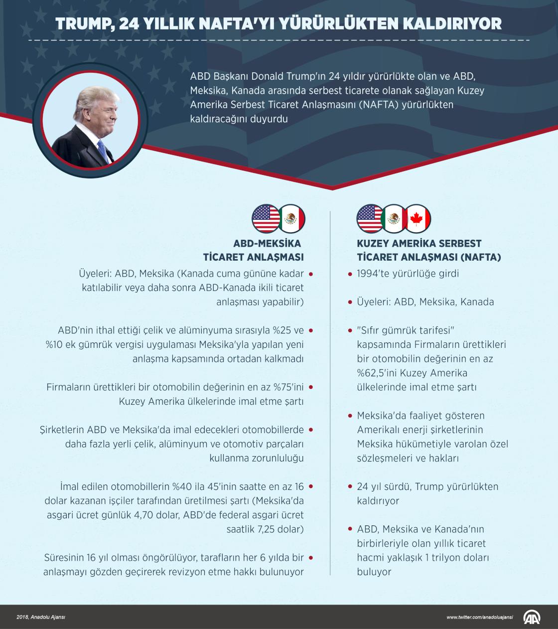 ABD Başkanı Donald Trump, 1994'ten bu yana yürürlükte olan ve ABD, Meksika, Kanada arasında serbest ticarete olanak sağlayan NAFTA'yı yürürlükten kaldıracağını duyurdu. ABD'nin ithal ettiği çelik ve alüminyuma sırasıyla yüzde 25 ve yüzde 10 ek gümrük vergisi uygulaması ise Meksika'yla yapılan yeni anlaşma kapsamında ortadan kalkmadı.