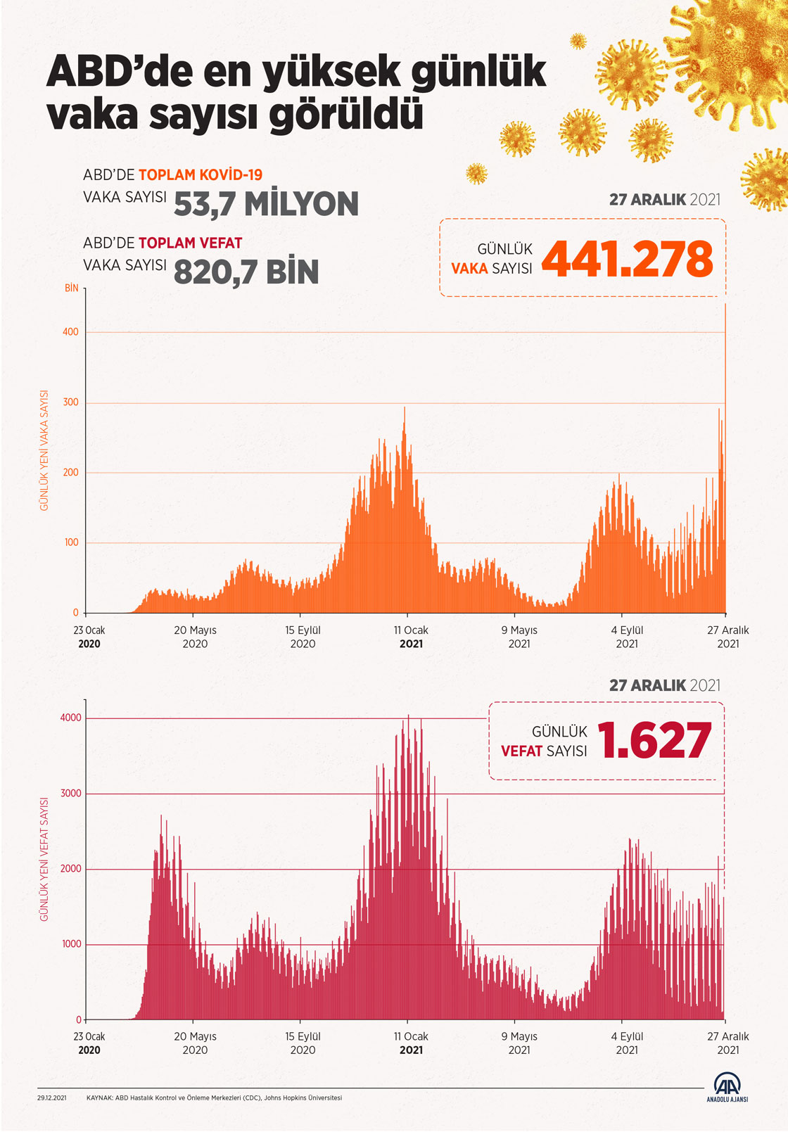 ABD’de dün, Kovid-19 salgınında tek günde 441 bin 278 vaka artışı ile en üst sayıya ulaşıldığı belirtildi.