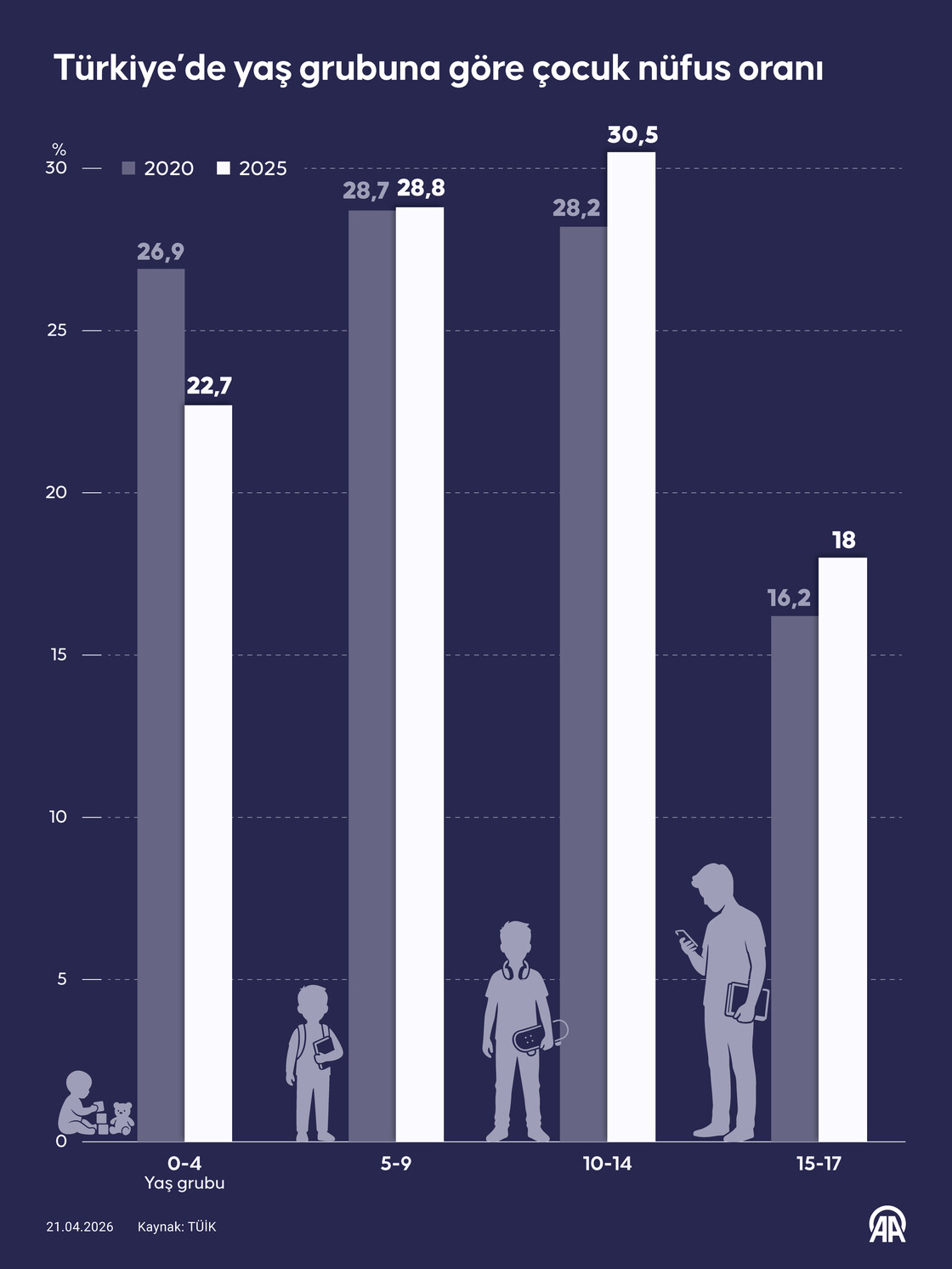 2020'de çocuk nüfusun yüzde 26,9'unun 0-4 yaş grubunda, yüzde 28,7'sinin 5-9 yaş grubunda, yüzde 28,2'sinin 10-14 yaş grubunda, yüzde 16,2'sinin 15-17 yaş grubunda yer aldığı görülürken 2025'te ise yüzde 22,7'sinin 0-4 yaş grubunda, yüzde 28,8'inin 5-9 yaş grubunda, yüzde 30,5'inin 10-14 yaş grubunda, yüzde 18'inin 15-17 yaş grubunda yer aldığı belirlendi.Mehmet Yaren Bozğun