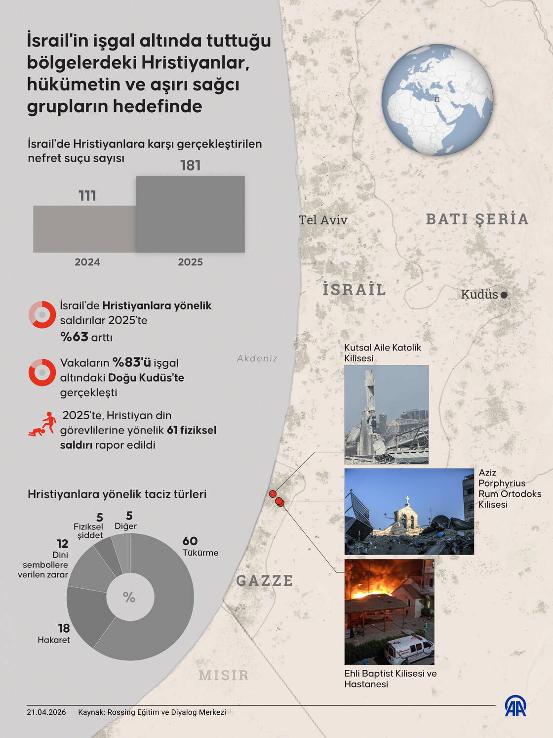 İsrail’in soykırım uyguladığı Gazze Şeridi, işgal altında tuttuğu Batı Şeria, Doğu Kudüs ve Lübnan’ın güneyinde yaşayan Hristiyan toplumu, İsrail hükümetinin ve aşırı sağcı grupların artan fiziki saldırıları, mülke zarar verme eylemleri ve kutsal mekanları kundaklama girişimleri nedeniyle tarihsel bir varoluş tehdidiyle karşı karşıya bulunuyor.Mehmet Yaren Bozğun