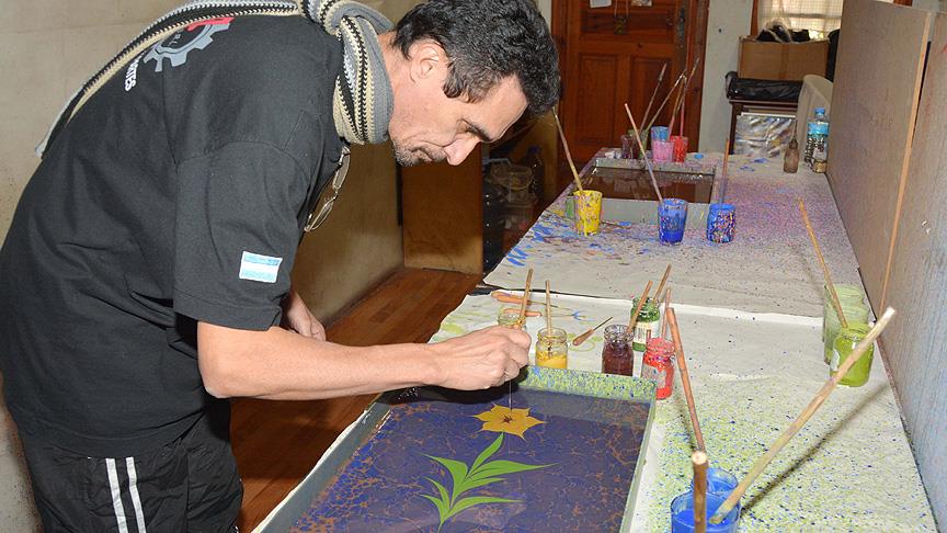 Arjantin'den Menteşe ilçesine gelen tango hocası Jose Freire, Menteşe Belediyesi ebru ustası Yavuz Merih Ulubay'dan aldığı derslerle klasik Türk ebrusu öğreniyor.