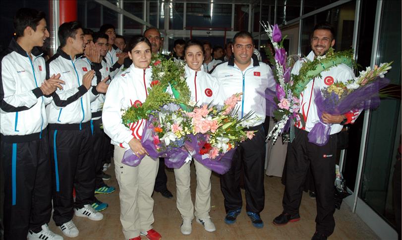 3. İslami Dayanışma Oyunları'nda karatede Türkiye'yi temsil eden milli takım sporcuları Necati Pınarbaşı, Ece Yaşar ile Aydan Akbulut, Erzurum'da davul zurna eşliğinde karşılandı.