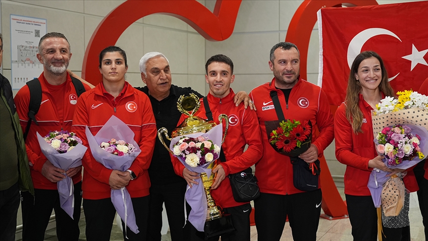 Sabiha Gökçen Havalimanı'nda çiçeklerle karşılanan milli sporcular, basın mensuplarına açıklamada bulundu.