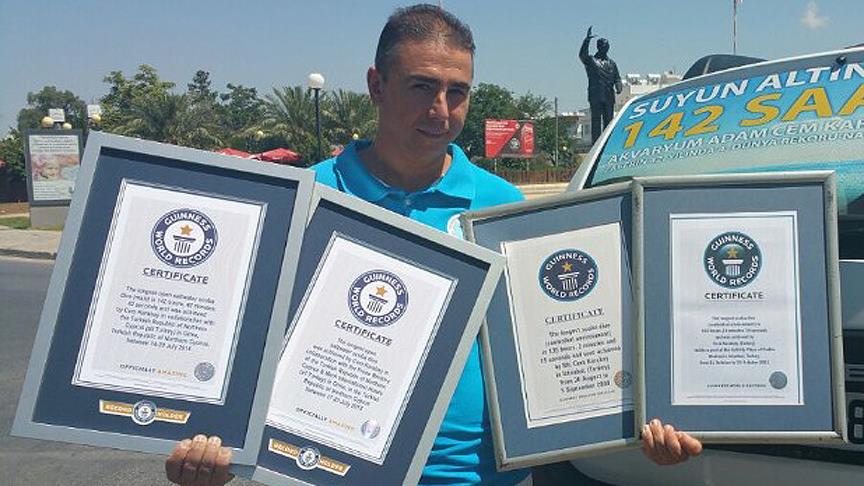 "Su altında en uzun süre yaşayan insan" rekorunu, 142 saat, 42 dakika, 42 saniyelik derecesiyle 4. kez geliştiren Cem Karabay, Guinness Dünya Rekorları Kitabı'na girdi.