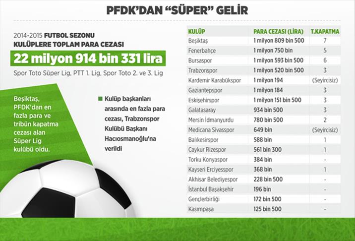 Türkiye Futbol Federasyonu (TFF) Profesyonel Futbol Disiplin Kurulu (PFDK) kulüplere toplam 22 milyon 914 bin 331 lira para cezası kesti.