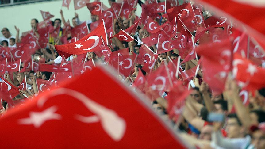 Tribünlerde de "Şehitler ölmez vatan bölünmez" sloganları atılırken, dev Türk bayrağı açıldı.