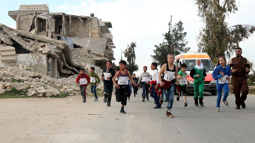 İç savaşın 6'ncı yılına girdiği Suriye'nin İdlib kentinde bir yardım kuruluşu ve bir spor kulübünün organizasyonunda çocukların katıldığı maraton düzenlendi.