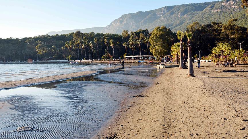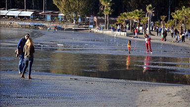 Öte yandan, hava sıcaklığının 20 derece ölçüldüğü Akyaka Mahallesi'nde hafta sonu tatili için sahile gelen çok sayıda kişinin, suların çekildiği yerlerde denize doğru yürüyerek fotoğraf çektirdiği gözlendi.