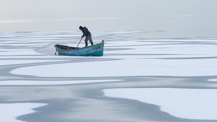 Buzla kaplı olmasına rağmen balıkçılık faaliyetlerine ara vermeyen az sayıda balıkçı da göl üzerinde ekmek mücadelesi veriyor.