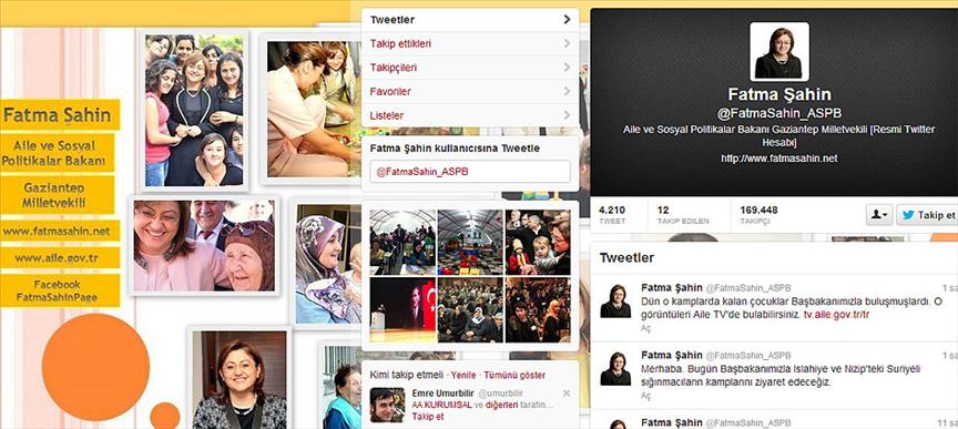 Aile ve Sosyal Politikalar Bakanı Fatma Şahin, sosyal paylaşım siteleri Twitter ve Facebook'ta açtığı hesaplar aracılığıyla hem çalışmalarını anlatıyor hem de vatandaşlardan sorunları ve talepleri konusunda bilgi alıyor.