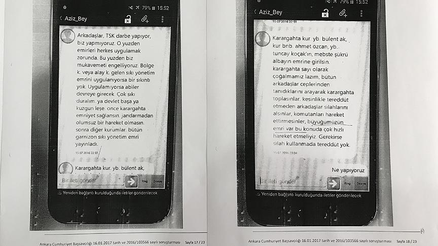 Buna göre, "Aziz Bey" isimli kişi 15 Temmuz 2016 saat 22.23'te Hancılar'a, "Arkadaşlar bize karşı büyük bir hareket var. Hep birlikte gücü ele geçirmemiz lazım. Kesinlikle tereddüt yok, darbe yapıyoruz. Hizmetten grup arkadaşlarınıza da ulaşıp görevlerinin başına geçmelerini isteyin." mesajını gönderdi.