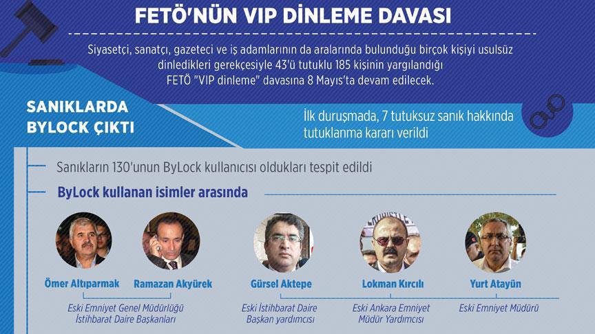 Siyasetçi, sanatçı, gazeteci ve iş adamlarının da aralarında bulunduğu birçok kişiyi usulsüz dinledikleri gerekçesiyle eski Emniyet Genel Müdürlüğü İstihbarat Daire Başkanları Ramazan Akyürek ve Ömer Altıparmak, eski emniyet müdürleri Ali Fuat Yılmazer ile Yurt Atayün'ün de arasında bulunduğu 43'ü tutuklu 185 kişinin yargılandığı FETÖ "VIP dinleme" davasına devam edildi.