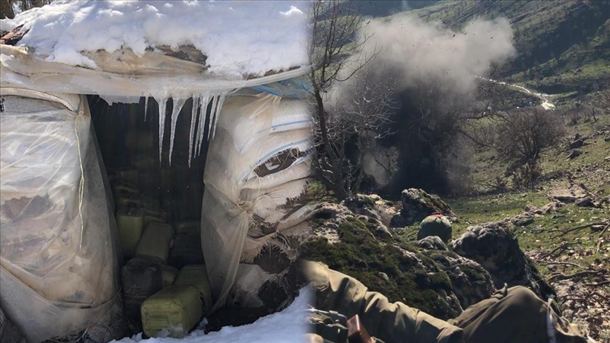Üç istikametten girişi ve çıkışı bulunan, tahkim edilmiş mağaralarla sığınaklarda bir kısmı amonyum nitrat ve çivi ile güçlendirilerek hazırlanmış el yapımı patlayıcı düzeneğiyle bunların yapımında kullanılan çeşitli malzemeler bulundu.
