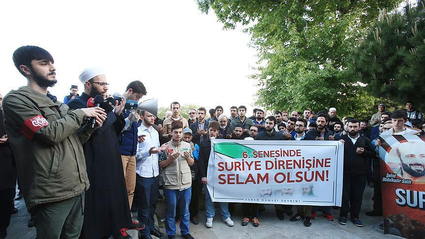 Üsküdar'daki Mihrimah Sultan Camisi'nde, Sabah Namazı Devrimi grubu tarafından "Halep İçin Sabah Namazında Buluşuyoruz" etkinliği düzenlendi. Cami avlusunda toplanan gruptakiler, "Direnen Suriye halkının yanındayız", "İstikbal İslam'ındır" yazılı afişler taşıdı.