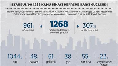 "İstanbul'da şu ana kadar bin 260 kamu binası ya tamamıyla yenilenerek ya da güçlendirilerek depreme hazır hale getirildi. 288 kamu binası yeniden inşa edilirken, 972'sinin güçlendirilmesi gerçekleştirildi. 784 okul binasının güçlendirilmesi tamamlandı. 259 okul ise yeniden inşa edildi. Şu anda 55 okulun yeniden yapımı devam ediyor. 101 sağlık, 43 idari, 28 yurt ve 16 sosyal hizmet binasının güçlendirilmesi gerçekleşti. 259 okulun yanı sıra 3 sağlık, 10 idari, 10 yurt ve 6 da sosyal hizmet binası olmak üzere 288 kamu binası yeniden yapıldı. Şu anda 65 kamu binasında da çalışmalar devam ediyor. Yine fizibilite çalışmaları devam eden neredeyse 200 yakın da ayrıca bina ve hizmet alanı bulunmakta. Toplamda bin 325 kamu binası elden geçirilmiş olacak."