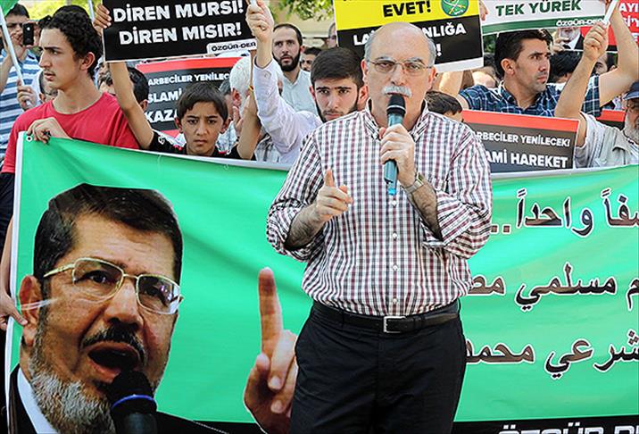"Türkiye'den Mısır'daki Müslüman kardeşlere bin selam" pankartı açıp, "Diren Mursi, diren Mısır", "Vandallığa, baskılara, darbelere karşı çık", "İslami yönetime evet, laik azgınlığa hayır" şeklinde dövizler taşıyan grup, "Paşaların tankı susturamaz halkı", "İslami hareket engellenemez", "Tevhid, adalet, özgürlük" şeklinde sloganlar attı.