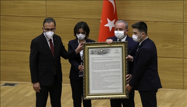 TBMM Başkanı Mustafa Şentop, 23 Nisan Ulusal Egemenlik ve Çocuk Bayramı kutlamaları kapsamında Milli Eğitim Bakanı Ziya Selçuk ve beraberinde çeşitli okullardan gelen öğrenci ve öğretmenleri Meclis Divan Salonu'nda kabul etti.