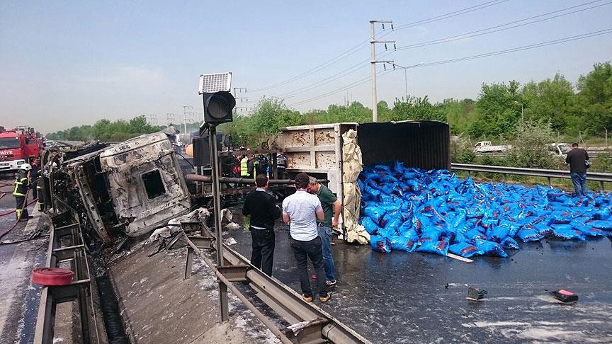 Devrilen tırdaki kömür torbalarının yola saçılması nedeniyle TEM Otoyolu'nun İstanbul yönünde ulaşım yaklaşık 2 saat sağlanamadı.