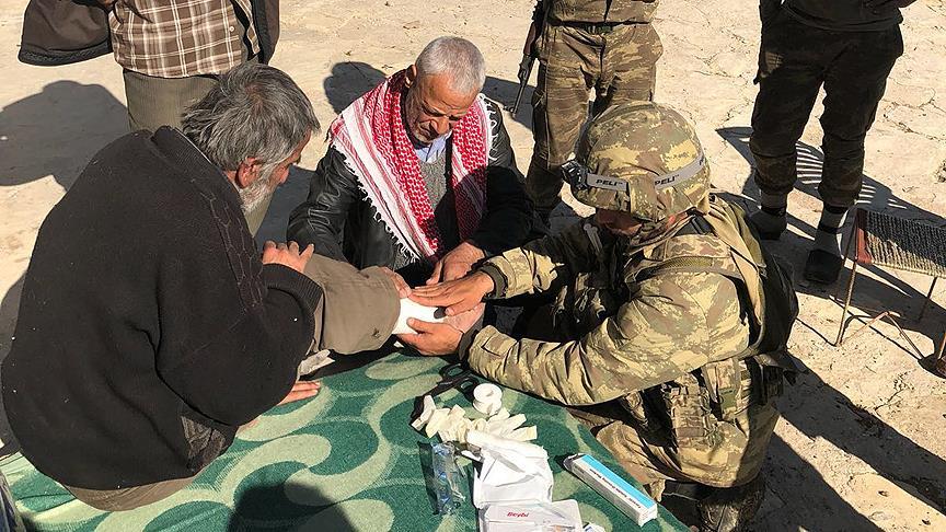 Türk Silahlı Kuvvetlerinin (TSK) komando birliği, Afrin’de teröristlerden temizlenen Mamel Uşağı köyünde sivillere yardım dağıtarak, bacağında yarası bulunan bir yaşlıya tıbbi destek verdi.