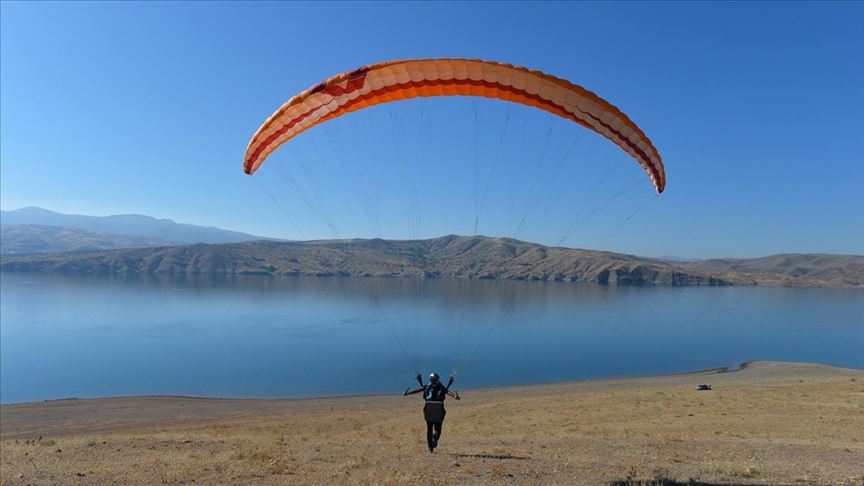 Tunceli'de 10 günlük yamaç paraşütü eğitimini tamamlayan kursiyerler Pertek ilçesindeki Keban Baraj Gölü kıyısındaki tepeden atlayış gerçekleştirdi. ( Haydar Toprakçı - Anadolu Ajansı )