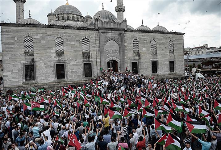Tekbir getiren ve İsrail yönetimi aleyhine slogan atan grup, Gazze'de ölen Müslümanlar için gıyabi cenaze namazı kıldıktan sonra dağıldı.