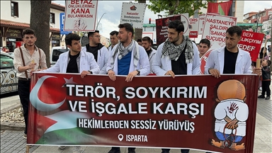 Manisa Tabip Odası, Manisa Diş Hekimleri Odası ile Sağlık ve Sosyal Emekçileri Sendikası da Manisa Ruh Sağlığı ve Hastalıkları Hastanesi önünde gösteri yaparak İsrail'i protesto etti.