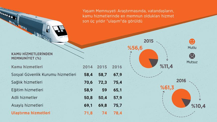 2014'te yüzde 71,8 ile kamu hizmetleri alanında birinci sıraya yerleşen bireylerin "ulaşım hizmetleri"nden memnuniyeti, 2015'te yüzde 74'e yükselmişti. Vatandaşların bu alandaki hizmetlerden memnuniyeti 2016'da da yüzde 78,4'e yükselerek, zirvedeki yerini korudu.