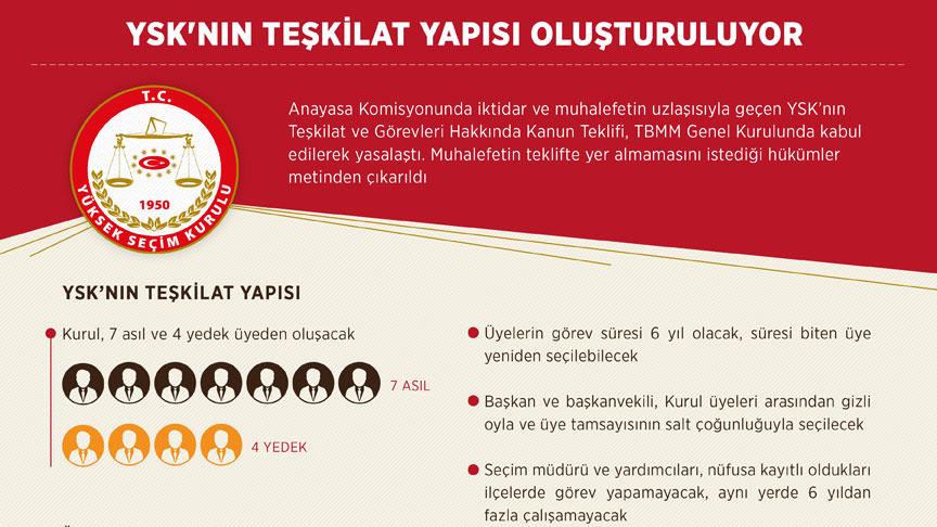 Anayasa Komisyonunda iktidar ve muhalefetin uzlaşısıyla geçen Yüksek Seçim Kurulunun (YSK) Teşkilat ve Görevleri Hakkında Kanun Teklifi, TBMM Genel Kurulunda kabul edilerek yasalaştı.