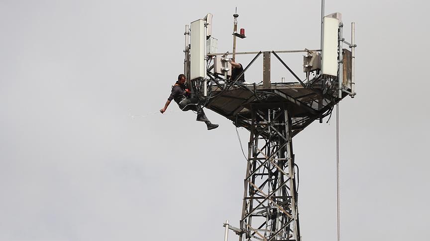 GSM firmalarının metrelerce yükseklikteki baz istasyonu kulelerine tırmanarak bakım-onarım yapan görevliler, bellerine bağladıkları kemerle havada askıda kalarak çalışıyor.
