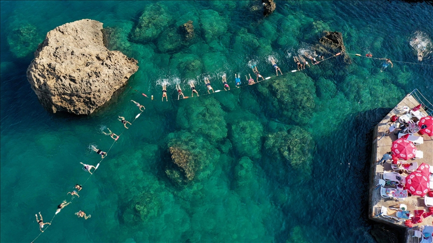 Spor eğitmeni Eylem Perçin, kursun 08.30-09.30 saatlerinde yapıldığını belirterek, "Pek çok spor dalından karma hareketlerin bulunduğu kursumuza rağbet, genellikle fizik tedavi hastalarından geliyor. Antalya'nın güzel doğasında, falezlerin tertemiz sularında neşeyle derslerimizi tamamlıyoruz." ifadelerini kullandı.