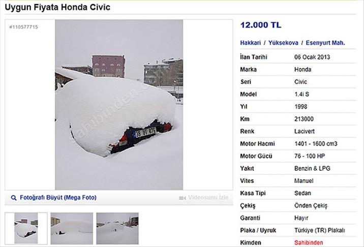 Şirket açıklamasına göre, ilan sahibinin yüklediği fotoğraflarda tamamı karlarla kaplı ve plakadan başka hiçbir yeri görünmeyen 1998 model lacivert otomobil, 12 bin liradan satışa sunuluyor.