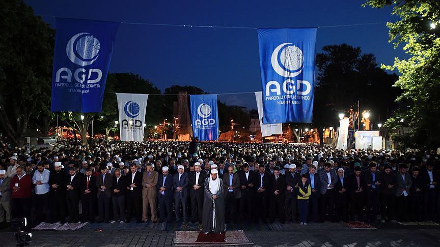 Anadolu Gençlik Derneği (AGD) mensupları, İstanbul'un fethinin 563. yıl dönümü kutlamaları kapsamında Ayasofya'nın camiye dönüştürülmesi için "Seccadeni al da gel" sloganıyla "Sabah Namazında Ayasofya Camii'nde buluşuyoruz" etkinliği gerçekleştirdi.