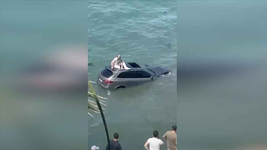 Araç sürücüsü, batmakta olan aracın üst bölümündeki camdan tavana çıkarak aracın üzerinde yardım bekledi.