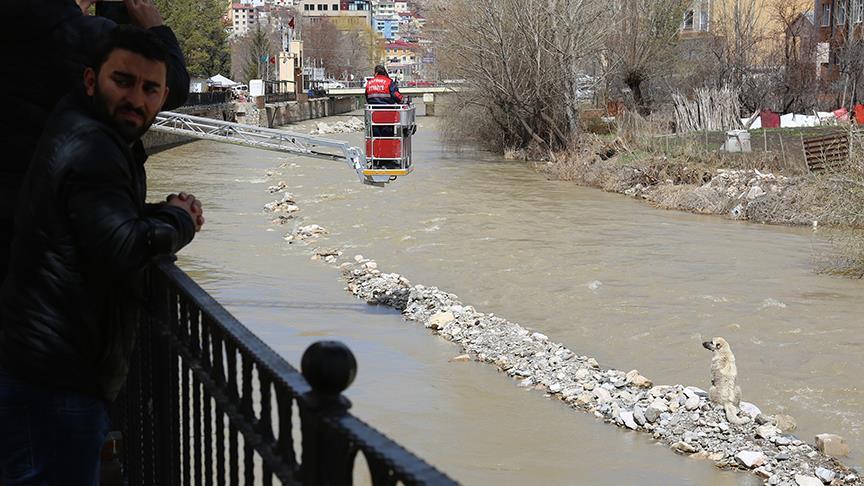 Harekete geçen itfaiye ekipleri, Çoruh Nehri'nin kıyısından uzattıkları itfaiye merdiveni ile köpeklerin bulunduğu alana ulaştı. Ekipler, buradaki köpeklerden birini alarak kıyıya getirdi.