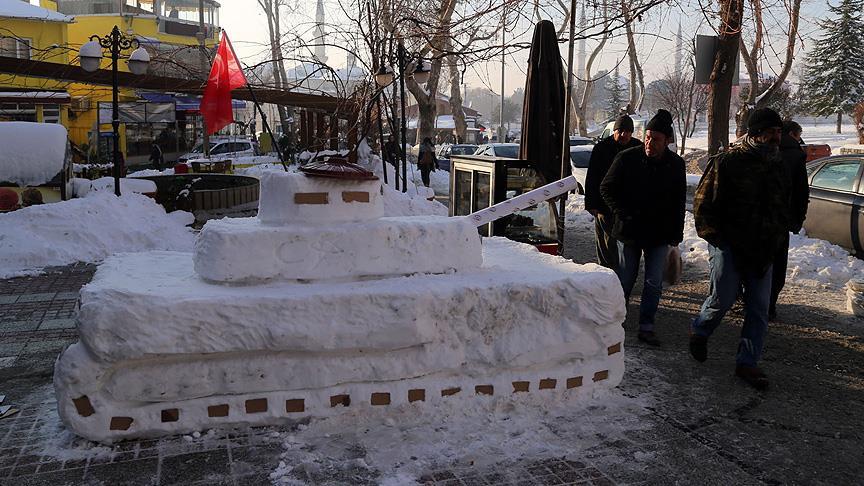 Bu sene de kardeşi ile iş yerinin önünde kardan tank yaptıklarını belirten Sarıca, "Karı bir araya getirmek için mahallemizin gençleri yardım ediyor. Gençler, 15 Temmuz darbe girişimine tepki amacıyla tank yapmamızı istedi. Biz de hain darbeyi kınamak için kardan tank yaptık." dedi.